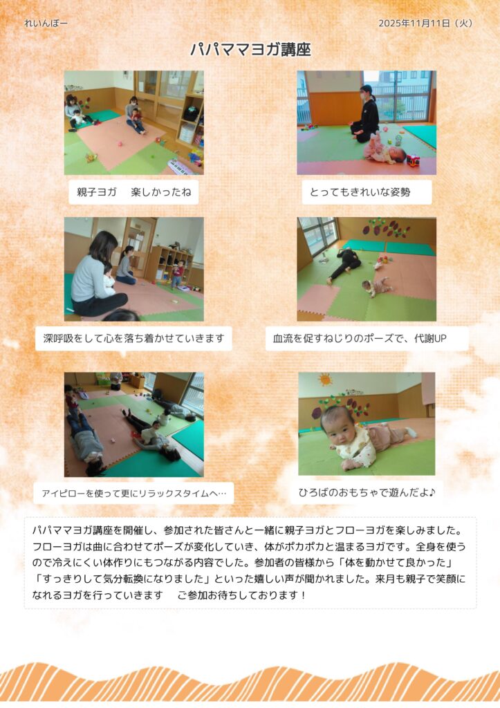 体が冷えやすくなってきたこの季節にぴったりの、パパママヨガ講座を行いました🧘