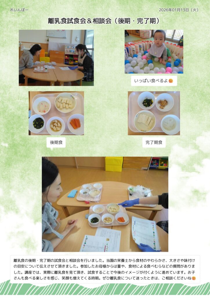 13日に離乳食試食会&相談会を行いました。今回は後期食・完了期食についてお話しました。