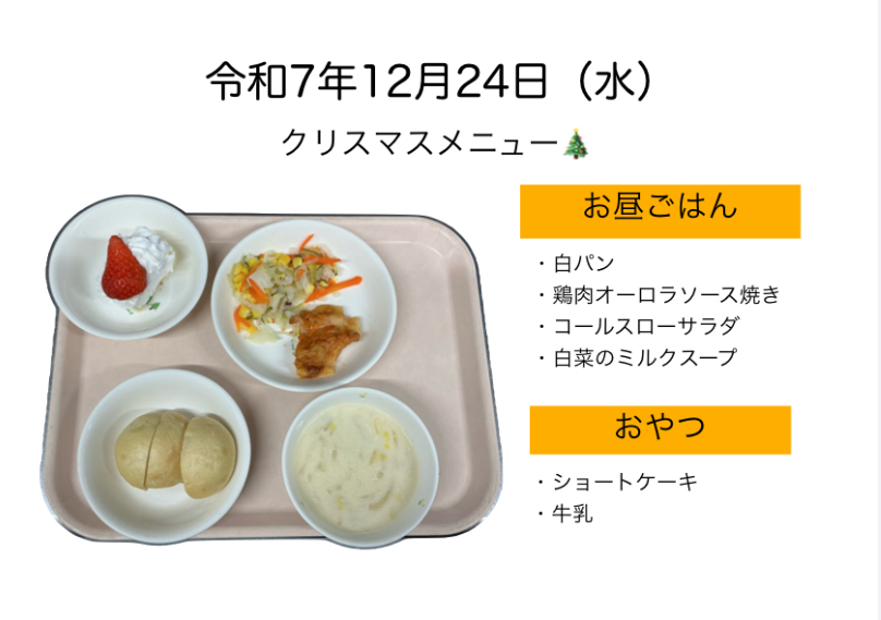 献立はクリスマスを意識したメニューで、おやつのショートケーキは大きないちごで子どもたちは喜んでくれました!