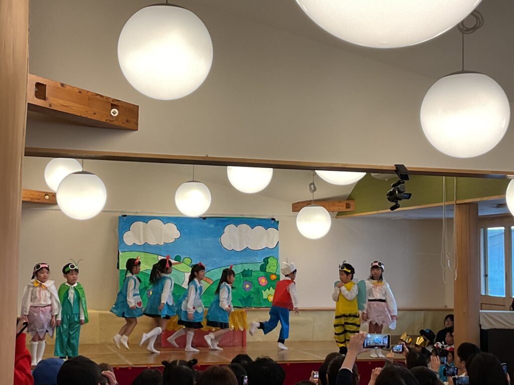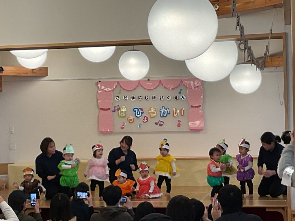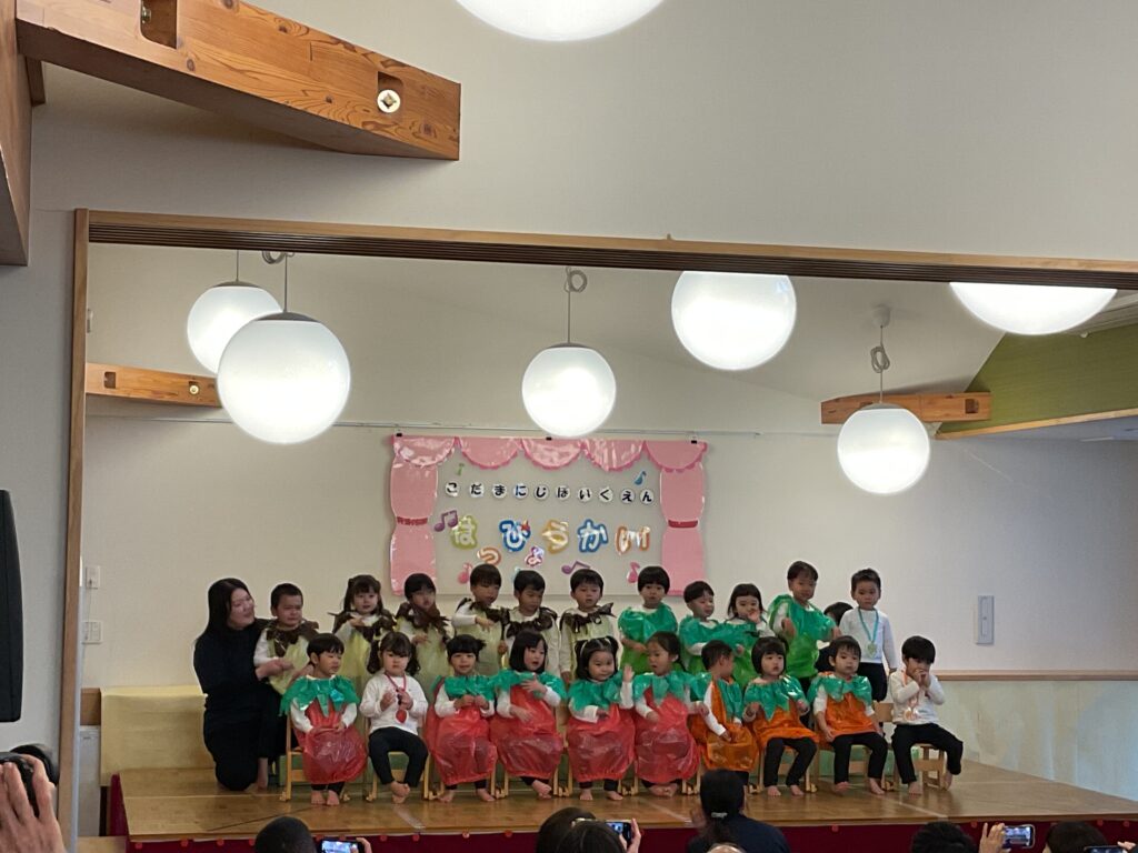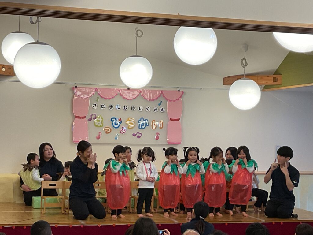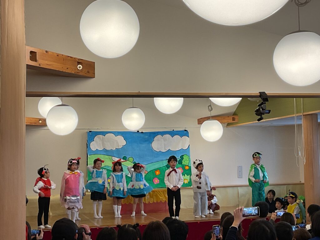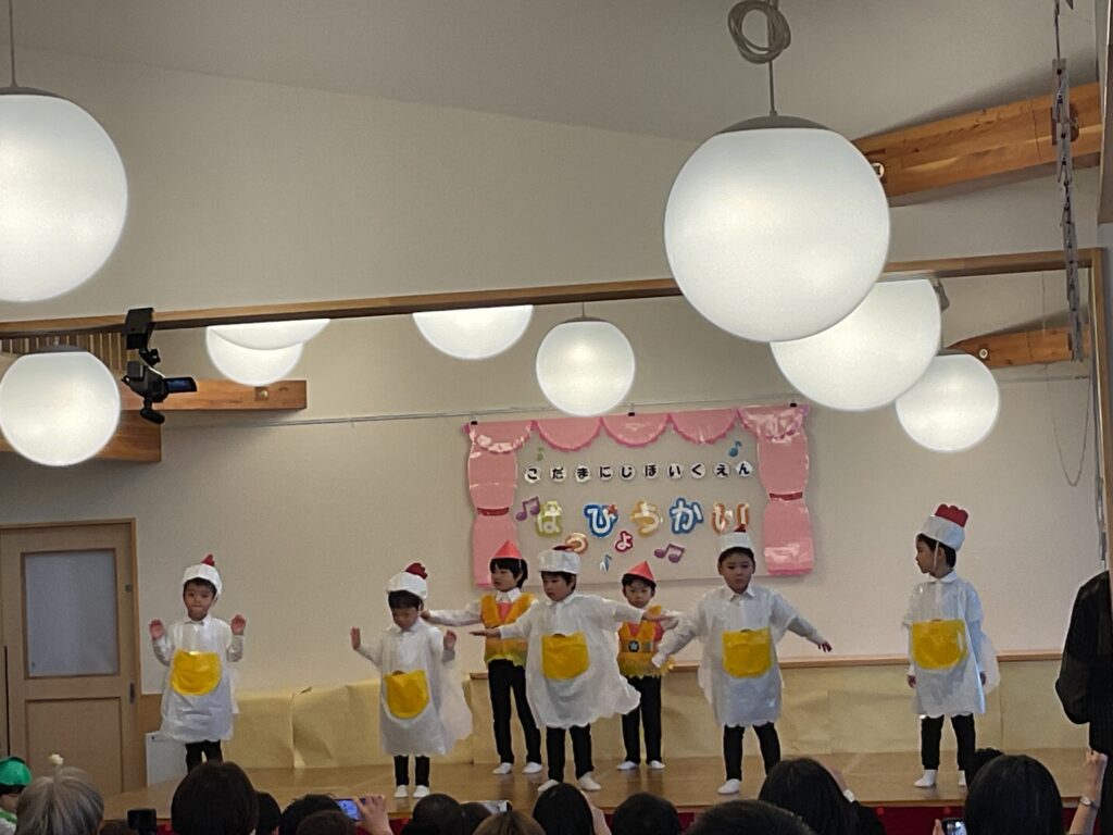 色とりどりの衣装に身を包んだ子どもたちが! 先生の声に合わせて、「トントントン!」と手を叩いたり、お友だちと顔を見合わせたり。 「幸せなら〜♪」の歌詞に合わせて、全身で喜びを表現する姿に、会場中が温かい拍手で包まれました。緊張して固まっちゃう子も無いちゃう子も、それはまた今日だけの特別な思い出ですね🐣