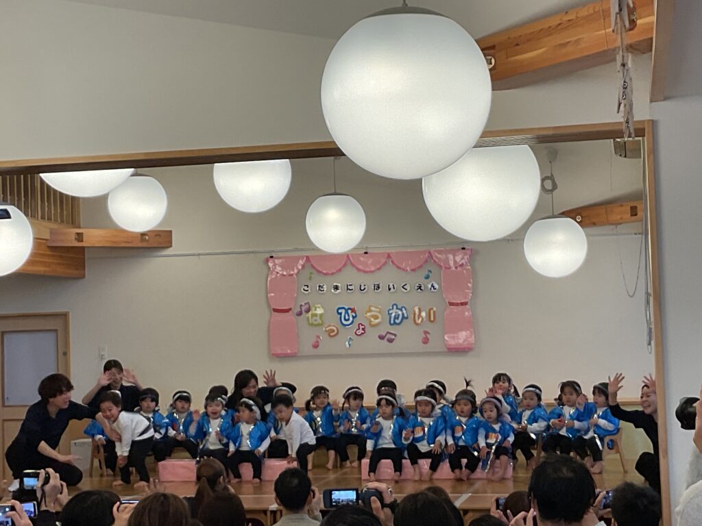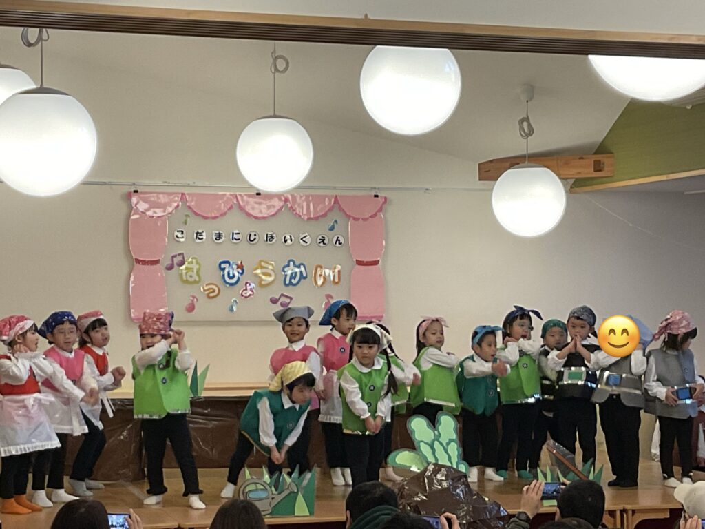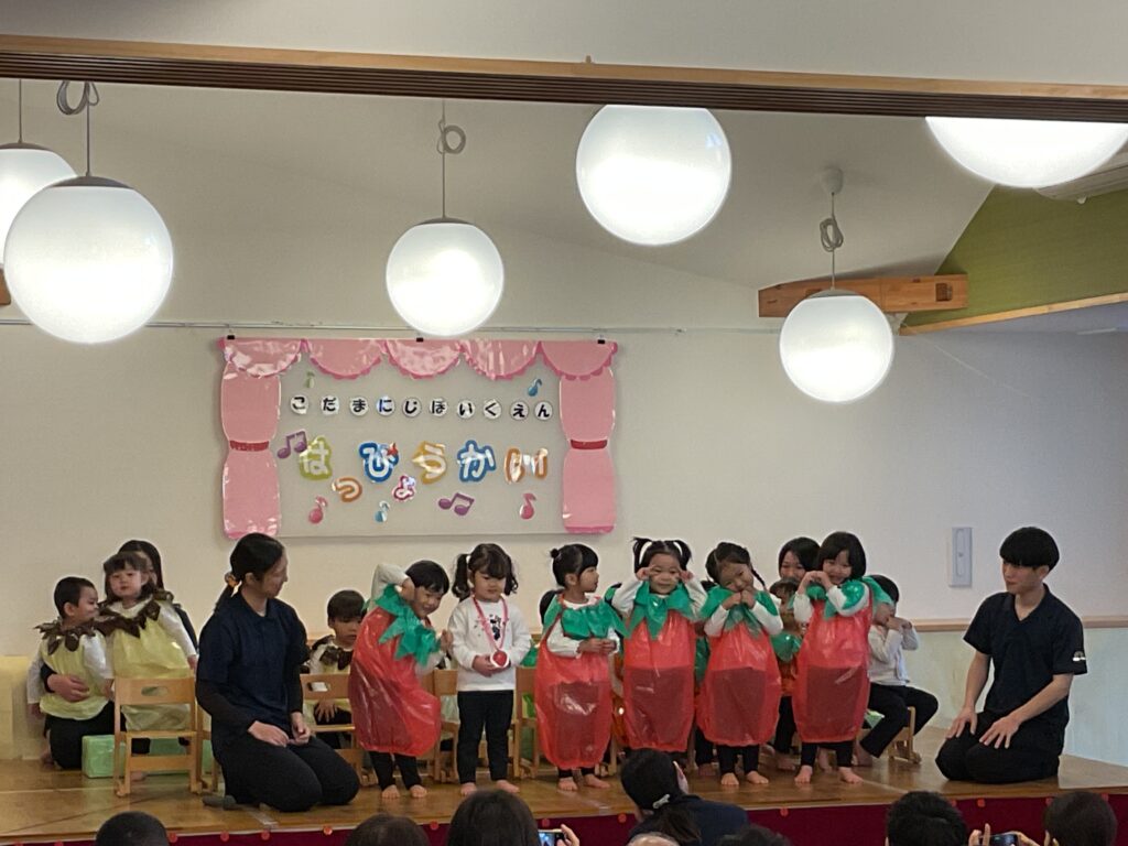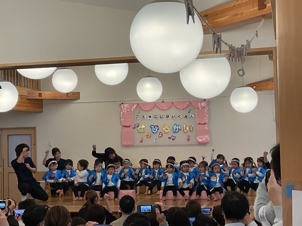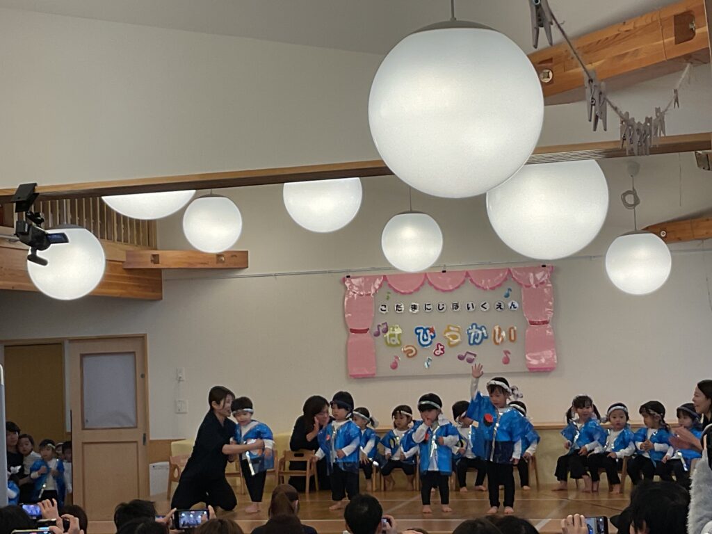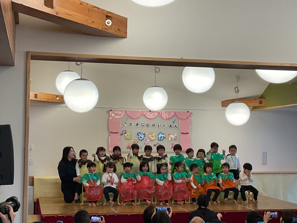 色とりどりの衣装に身を包んだ子どもたちが! 先生の声に合わせて、「トントントン!」と手を叩いたり、お友だちと顔を見合わせたり。 「幸せなら〜♪」の歌詞に合わせて、全身で喜びを表現する姿に、会場中が温かい拍手で包まれました。緊張して固まっちゃう子も無いちゃう子も、それはまた今日だけの特別な思い出ですね🐣