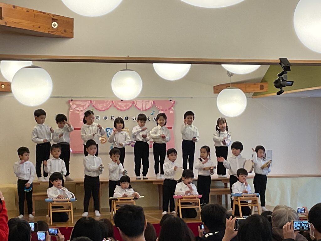 白シャツに黒いズボンでビシッと決めた子どもたちが登場。 みんなが大好きな「パプリカ」のメロディーに乗せて、カスタネット、スズ、タンバリン、そして鍵盤ハーモニカなど、それぞれの楽器で心を一つに奏でました。 真剣な表情で先生を見つめながらリズムを刻む姿に、日々の練習の積み重ねを感じ、目頭が熱くなりました!