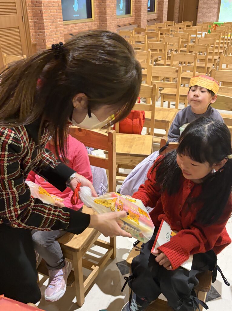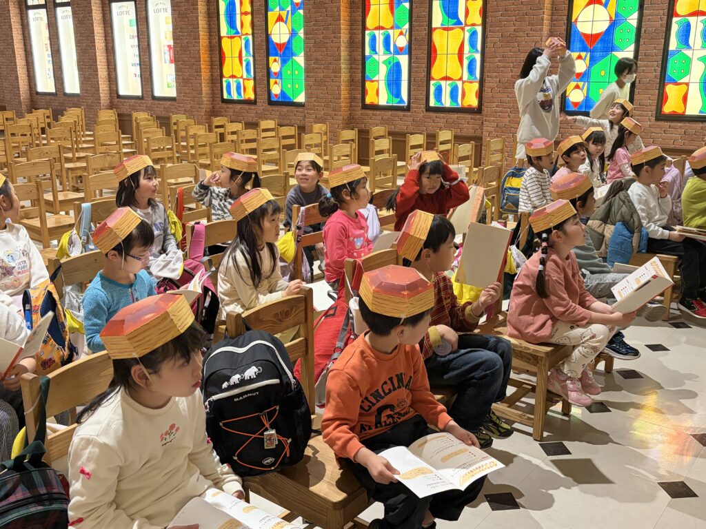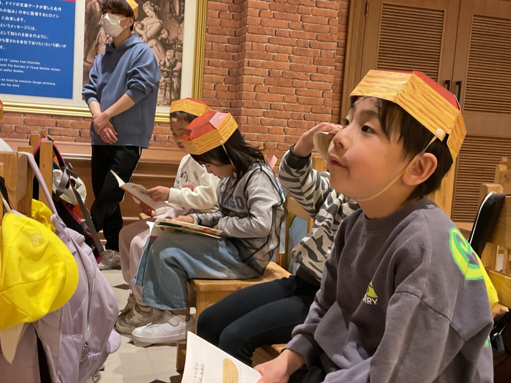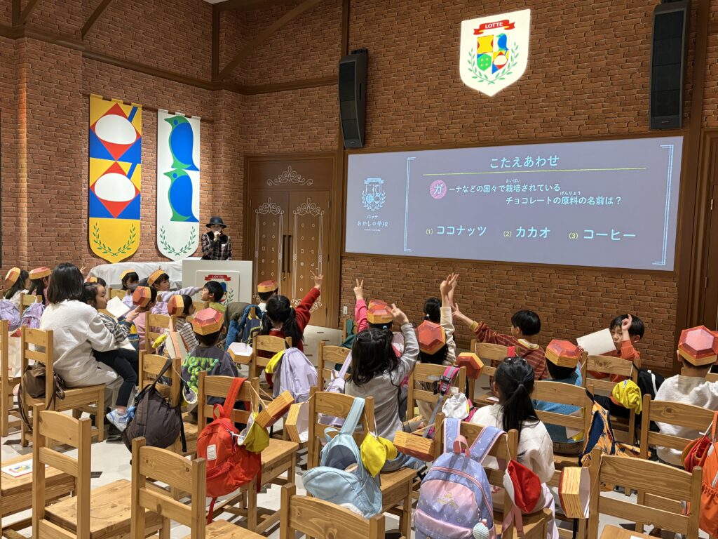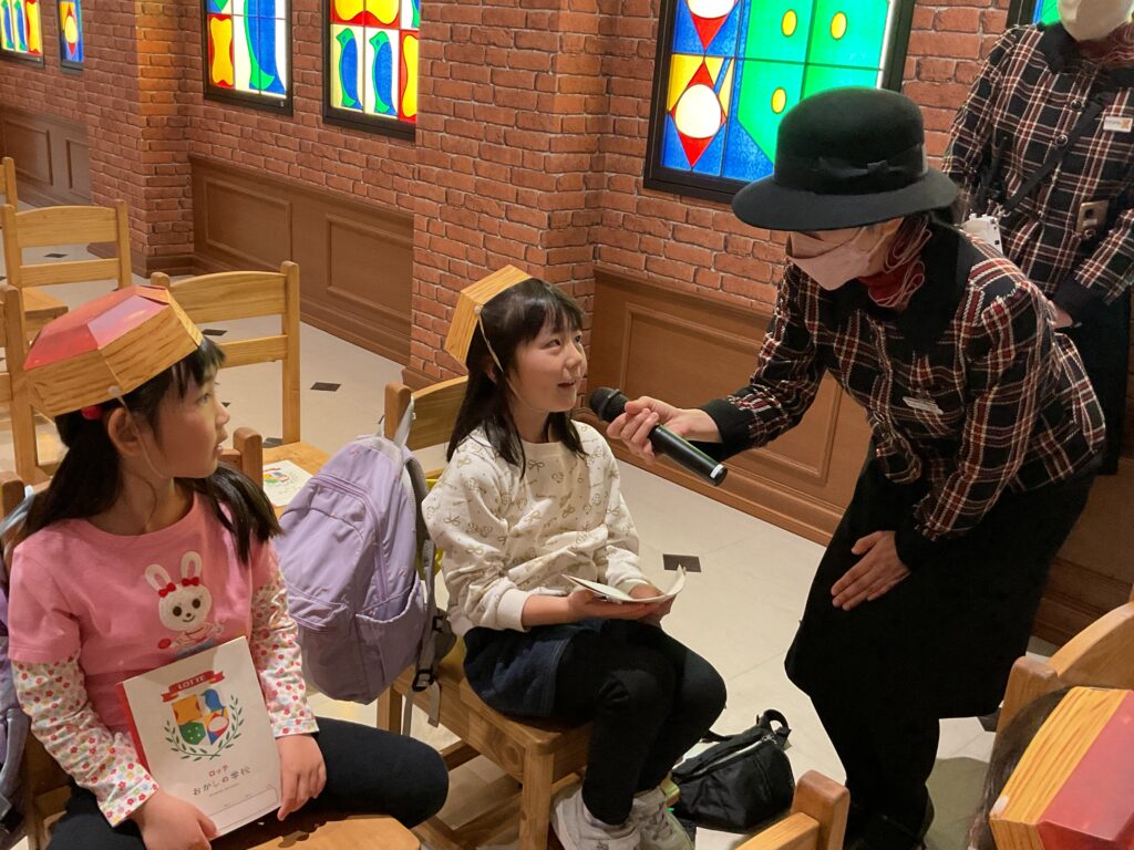 お菓子の学校の教室内に着くと、配布されたパイの実帽子をかぶって工場内へ