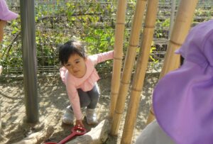 園庭の端の小屋に興味深々でしたね🎵ちょうど2歳児クラスのお友だちが遊んでいました‼