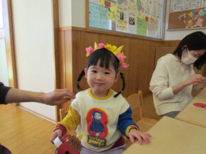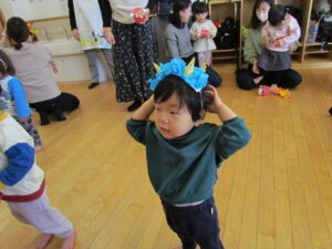 出来上がった、鬼のカチューシャをつけて見せてくれました💕