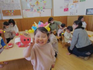 今日は親子教室ランラン(1歳児コース)があり、節分に向けて鬼のカチューシャ、枡づくりを行いました✨✨