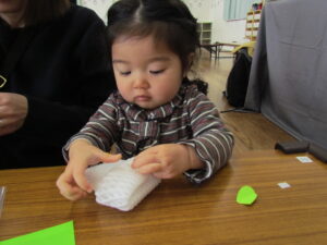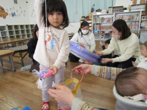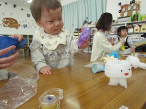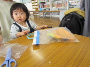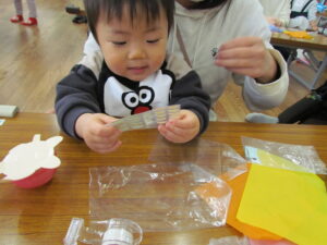 ビニール袋にお花紙を入れ、カラフルなおさかなさんが出来ましたね(^^♪