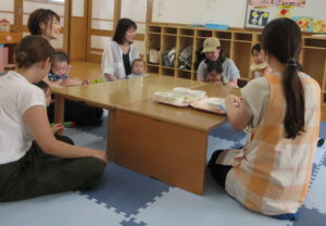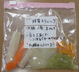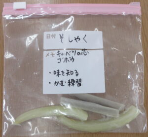 手づかみ食べ講座では、【お野菜から食べ始めるとお野菜嫌いになりにくい】というお話を聞いたり、保護者の方が目を離さないようにしながら、【ごぼう】や【キャベツの芯】をしゃぶらせてあげることで味を知ったり噛む練習になったりするということがとても印象的でした。皆さん真剣に聞いていらして、質問や今の離乳食の進み具合も色々お話しされていました。