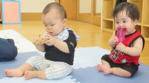 広いマットの上で好きなおもちゃを探して遊んでいました。