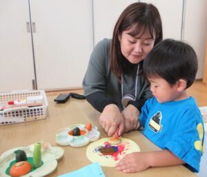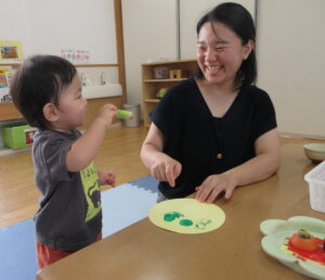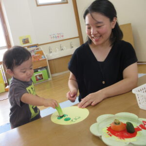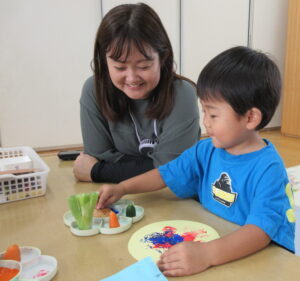 野菜スタンプでは、いつも食べている食材をスタンプしたので、手に取ると思わず口に運んでしまう子や、パレットの中で絵の具と食材がピタッとくっついてしまいなかなかつまめないでいる子、スタンプが楽しくて何枚もスタンプする子などいろいろな表情が見られてとても楽しかったです。