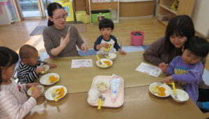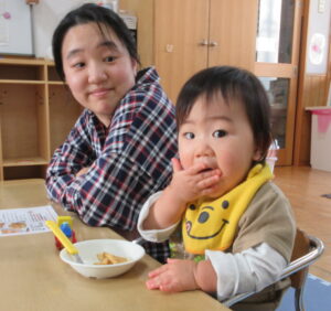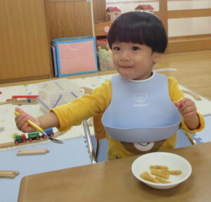 フォークが難しい子は手づかみ食べで上手にお口に運んでいました。
