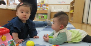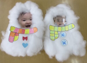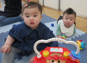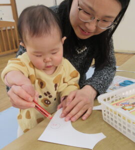 NewYearカード製作では、一生懸命製作しているお母さん達の隣や膝の上に乗って参加しようとやる気満々でした。