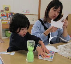 手形足形製作では、保護者と一緒にできた作品を眺めている様子もありました。