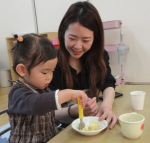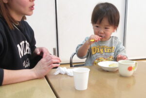 上手にフォークを使ってお口に沢山運んでいましたよ。