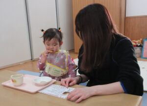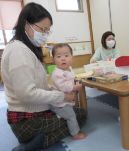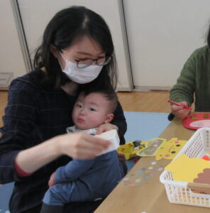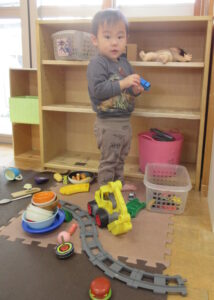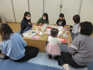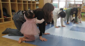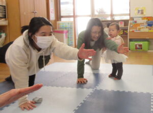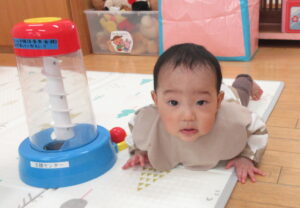 好きなおもちゃを出して自分の近くにみんな出してみたり、楽しそうなおもちゃの近くで足をバタバタさせてお友達や保護者がやってくれるのを待っているお友達もいます(ずり這いで前に進むようになりました)。