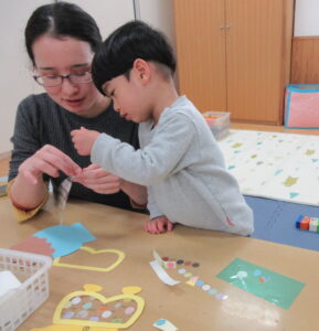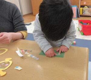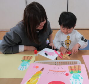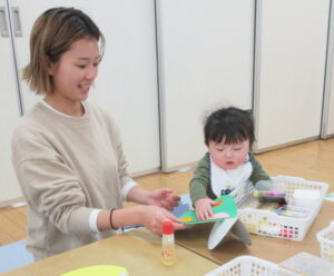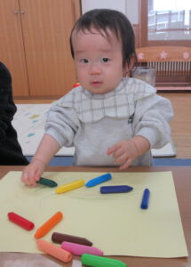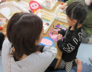 自分で色鉛筆やペンを持ってお絵描きできるお友達が増えてきて、保護者の近くで一緒におこなっている姿がとてもかわいいです。