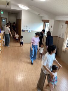 まずは、ホールをぐるぐるお散歩しながら場所に慣れてお友だちの顔を見て雰囲気にも慣れていきます。