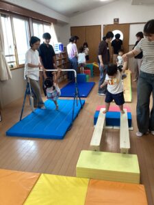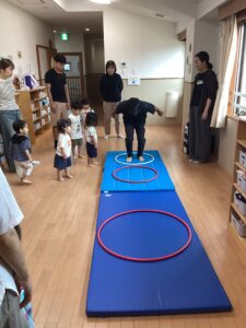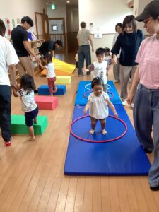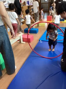 平均台が追加されたりフラフープがトンネルになったり変化を楽しみながら積極的に参加してくれました。