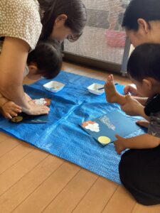 この時期ならではの小さな可愛い足型を、うさぎさんに見立てるため、白い絵の具で足型のスタンプを取ります。