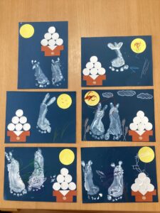 お月様やお団子を好きな場所に貼って、雲やススキなどお絵描きを楽しむ姿も見られました。