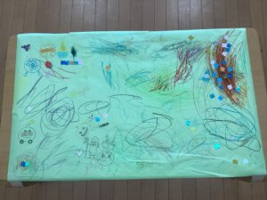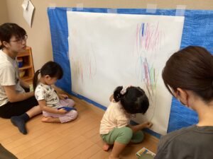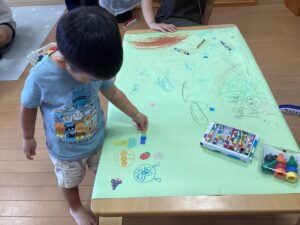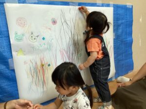お家では経験することが難しい大きさの模造紙を貼り、様々な色のクレヨンを使って力強く描いたり、シ-ル貼りをしたりと思い思いに楽しんでいました。