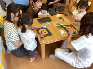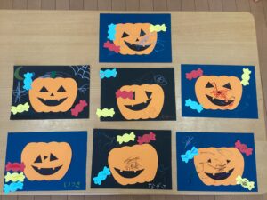 台紙に絵を描き、かぼちゃの顔やキャンディを貼りました。表情もデザインも一人ひとり違う可愛らしい『かぼちゃハロウィン』が完成しました。