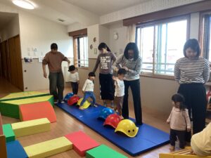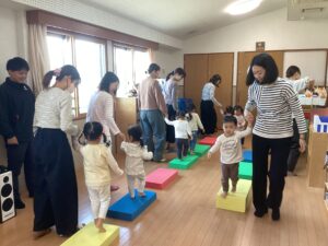 ウレタン積み木がたくさん並び、子どもだけが乗って渡ったり、親子で一緒に渡ったり…