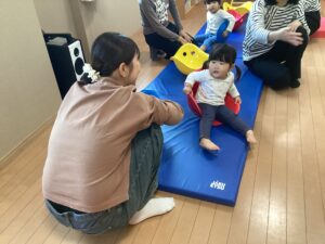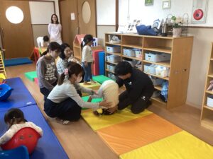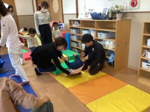 興味を持ってくれたお友だちは何度もチャレンジし、頭と背中を支えることでクルンとまわることができていました。