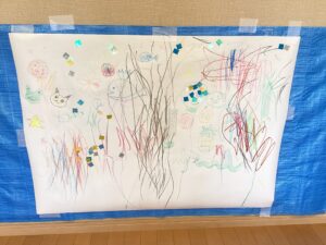 お家では経験することが難しい大きさの模造紙を貼り、様々な色のクレヨンを使って力強く描いたり、シ-ル貼りをしたりと思い思いに楽しんでいました。