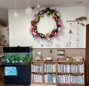 また、今年は4・5歳児がガーデナーさんと一緒にサツマ杉を使って作った大きなクリスマスリースが玄関に飾られています。