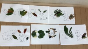園の植栽のお手入れをしてくださっているガーデナーさんが来てくださり、園庭にある葉っぱを使って動物の顔や体に見立てて思い思いに表現しました。