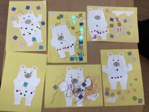 みんなの好きなシール貼りもしました。パンツの模様にシールを貼ってドット柄のパンツにするお友達もいました。それぞれの想いで無事に可愛い『しろくまのパンツ』が完成しました。