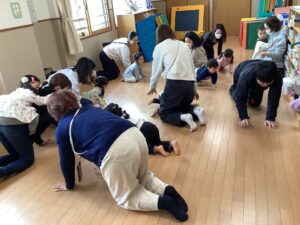 お母さんと一緒に、おしり歩きやハイハイをします。歩き出すとなかなか使わない部分を使って遊ぶことで身体の様々な機能を発達させていきます。