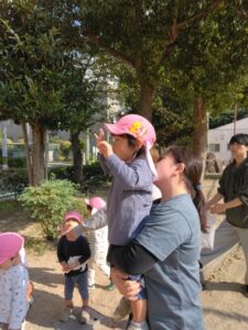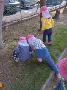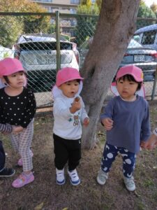 公園に着くと小さなどんぐりを沢山拾ったり、大きな葉っぱを見つけて園まで大事そうに持ち帰っていました。