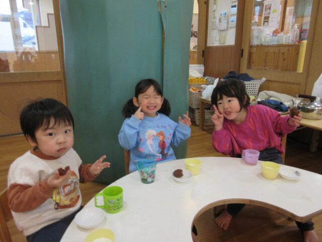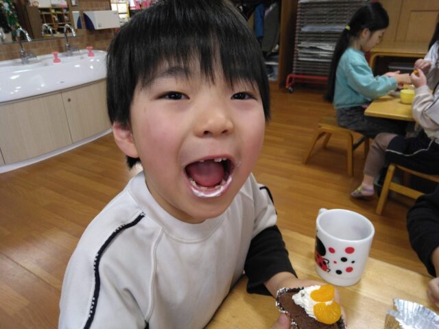 お口に生クリームをつけながら「ひげついてるー、サンタやん!」と笑い合いながらケーキを食べていました。