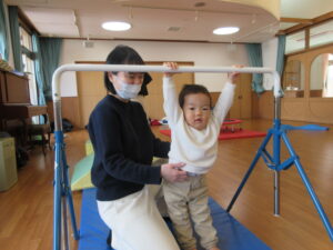 初めての鉄棒もお家の方と一緒にぶら下がったり、山の滑り台を使ってのぼってみたりして