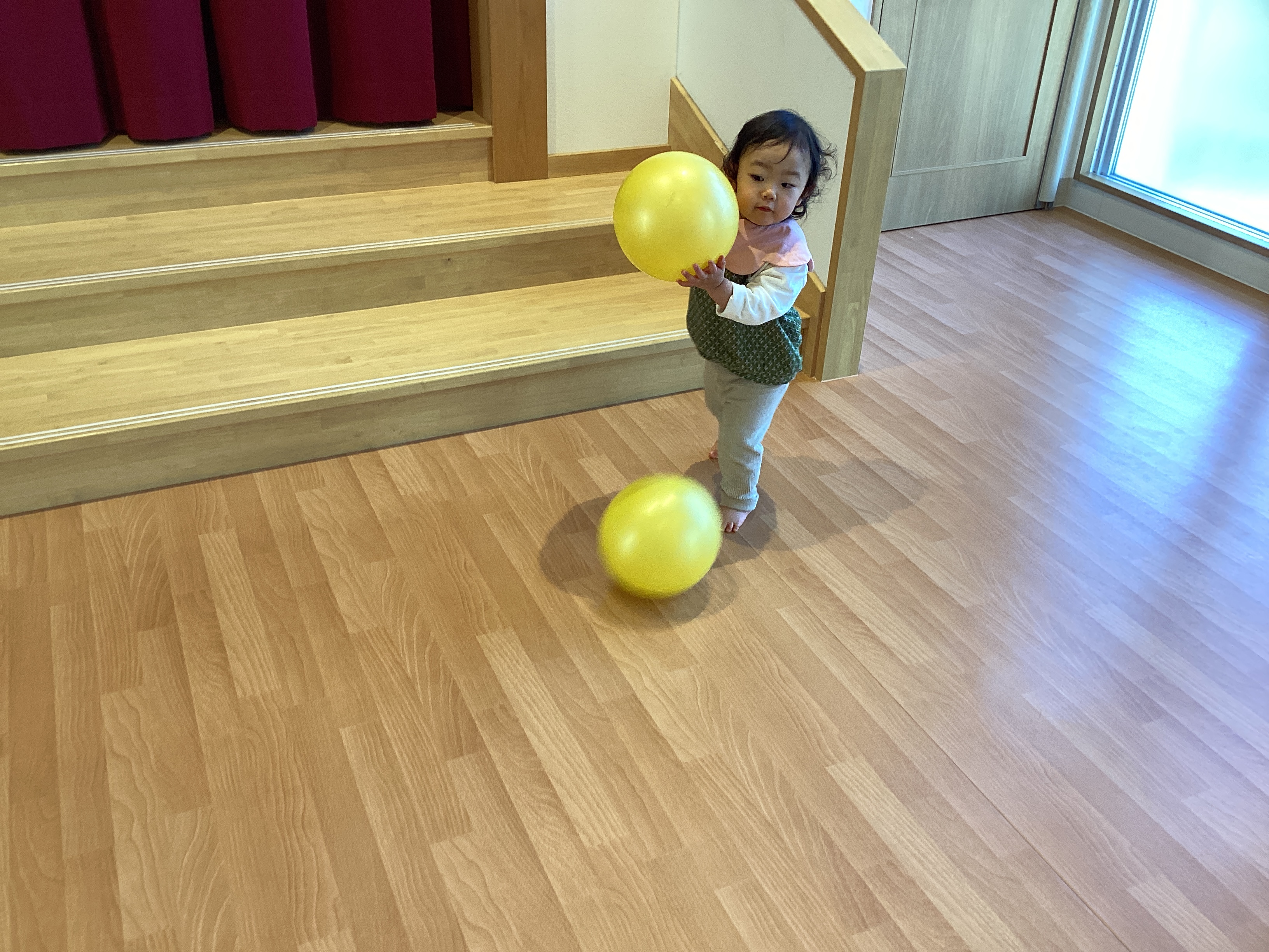 ボールを持って、お母さんに向かって「えい!」と投げます。