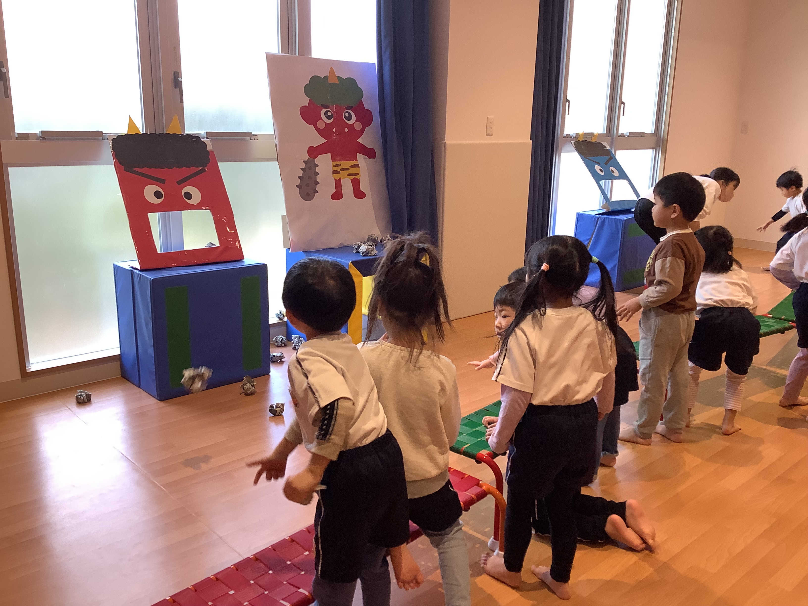 最後に、新聞紙で子ども達に豆を作って貰い、鬼のイラストの描いた的に向かって豆まきをしました。