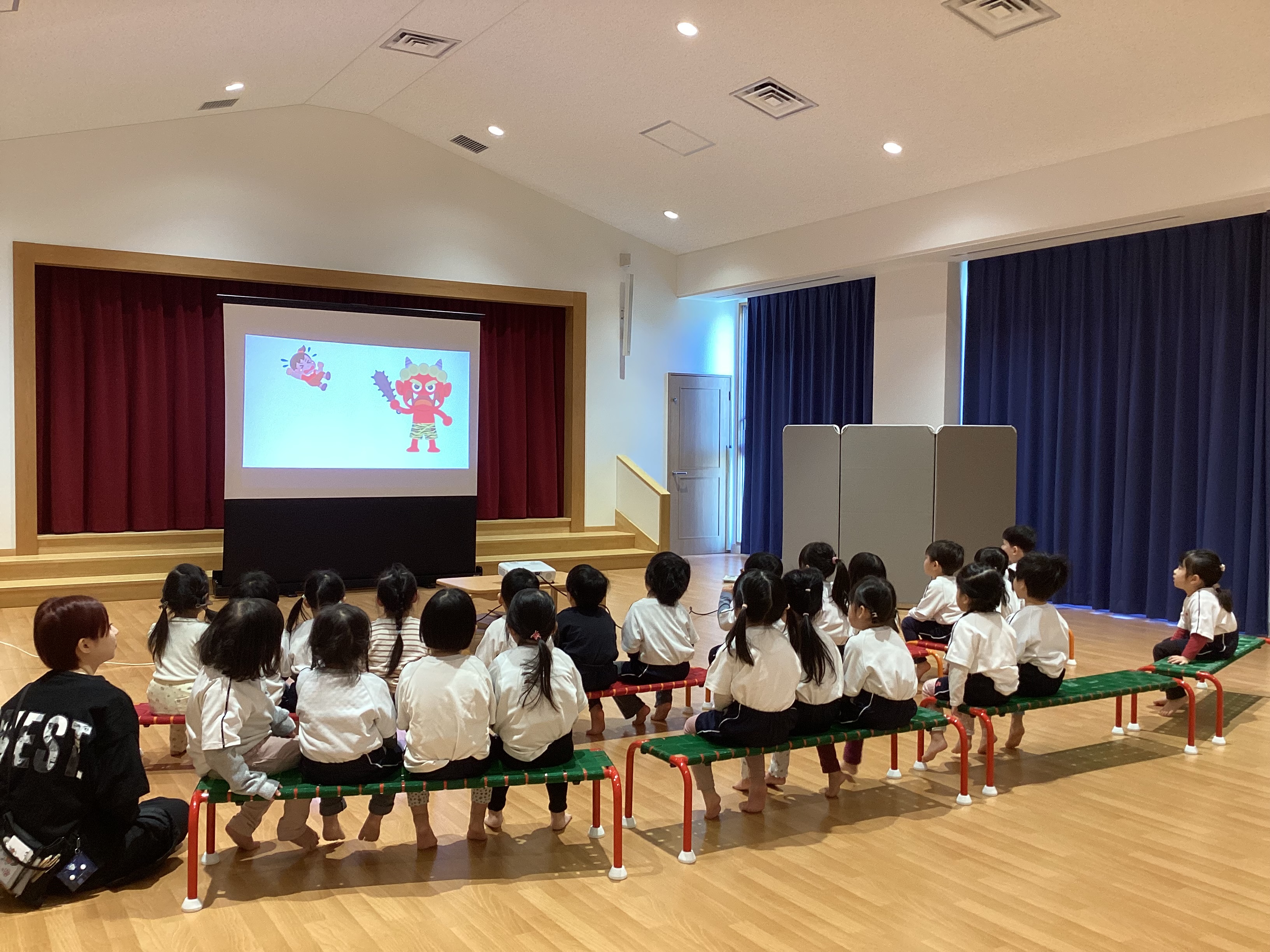 はじめに保育教諭から、節分の由来や節分で食べる食べ物についての話を聞きました。途中のクイズにも意欲的に参加してくれていましたよ。