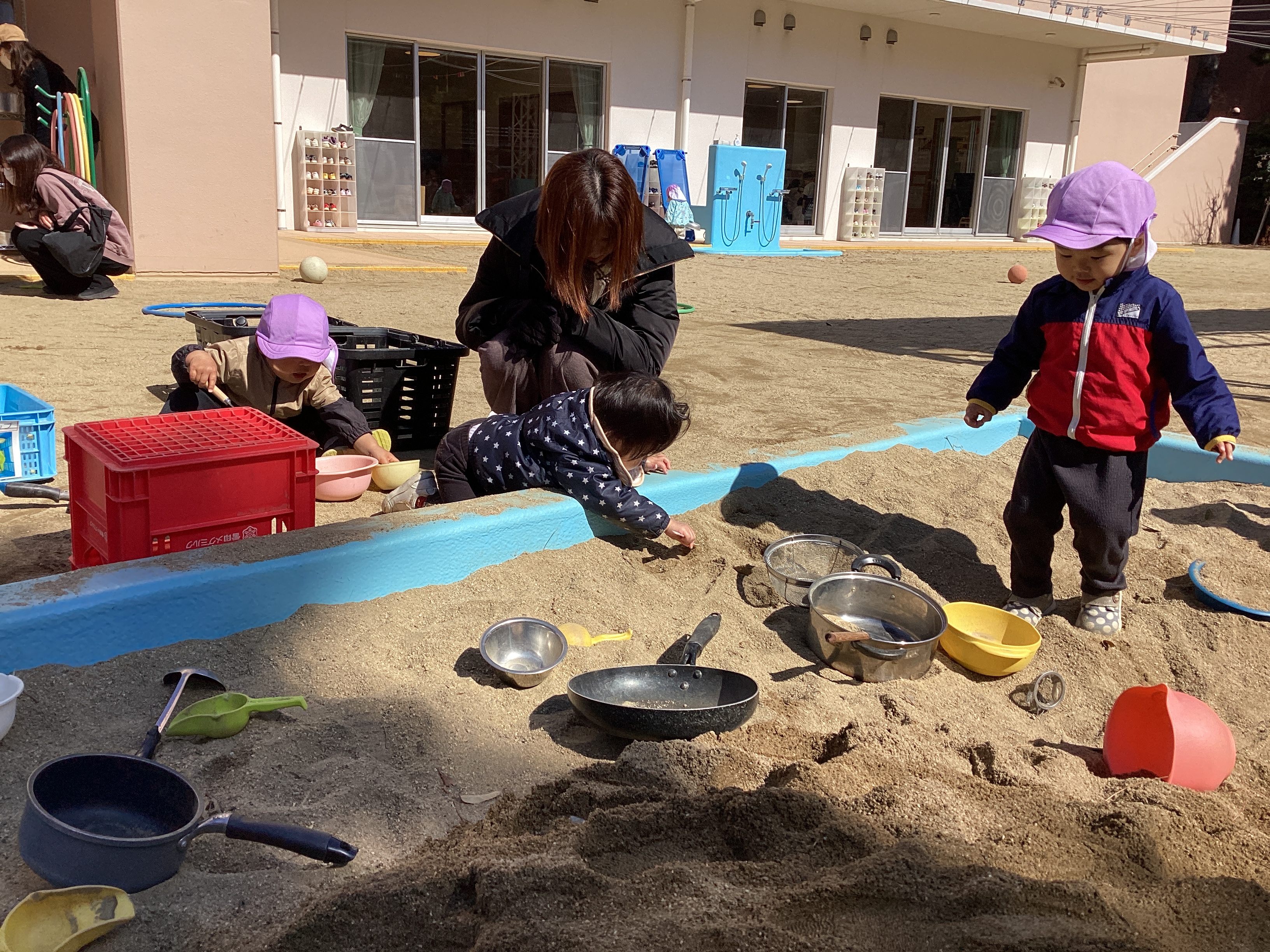 同じことに挑戦してみようと砂場の玩具を触ってみようとする姿があり、子どもたち同士で影響し合う姿が可愛らしいですね。