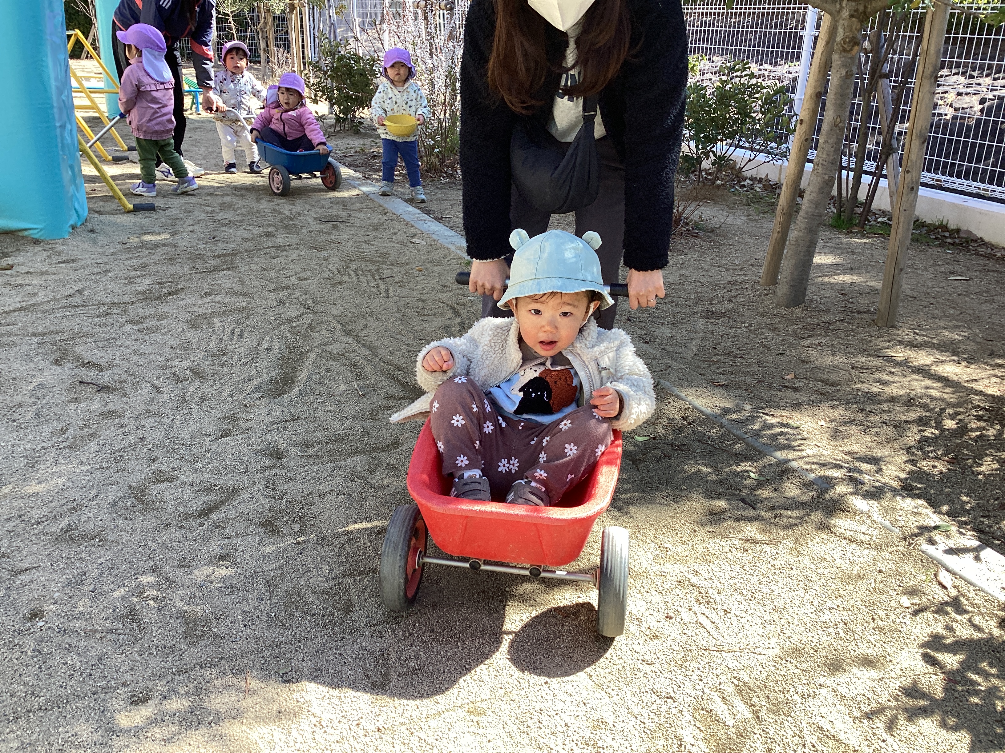 園のお友達が一輪車を車に見立てて運転し合いっこしている様子を見て、やってみたい!となり挑戦している様子です。大好きなお母さんに運転してもらってとても満足そうです!