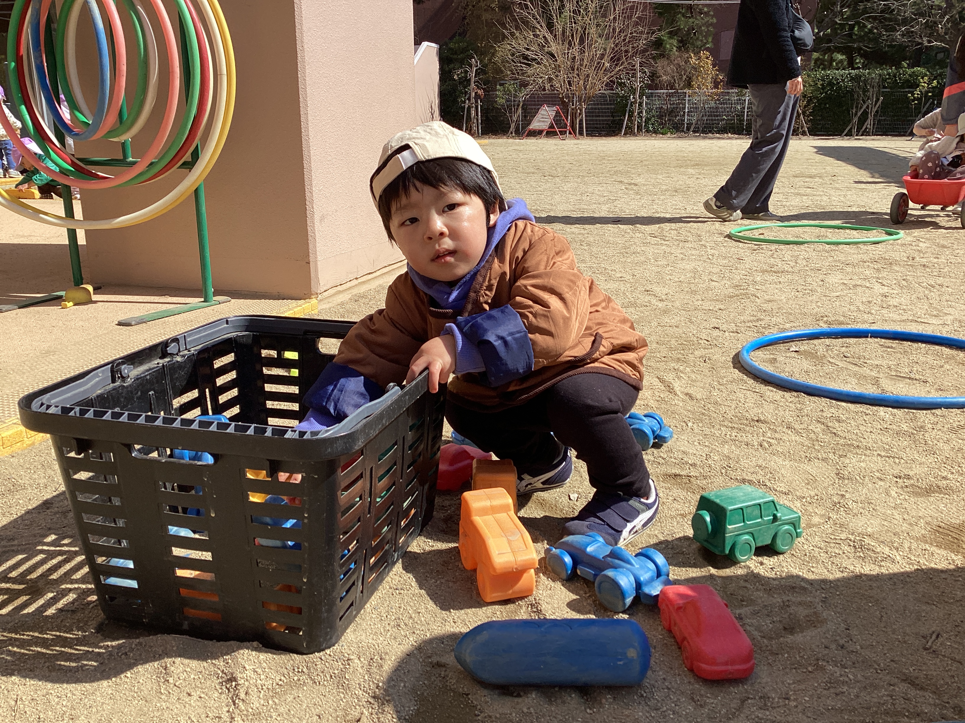 大好きな車をかごから出し入れしたり、並べたり走らせたり・・・夢中になっている時の表情が活き活きしていました!