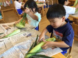 「どこからむこうかな〜」、「とうもろこし、もうすぐでてきそう!」と、かたい皮も頑張ってむいている様子がみられました!