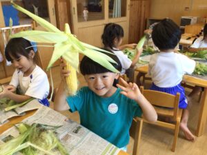 みんなが剥いてくれたとうもろこしは、美味しいおやつに変身し、嬉しそうに頬張って食べるあじさい組の子どもたちでした♪
