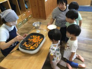 給食室の先生が、お部屋にホットプレートを持ってきて、子どもたちの前でにんじんを焼いてくれました。