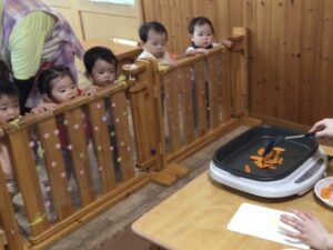 今日は目の前で人参を切ってもらったり焼いてもらったりして、食育を楽しみました。