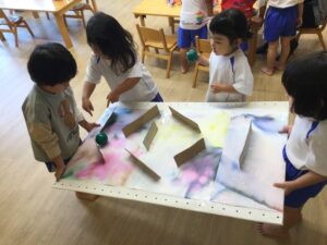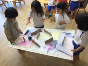 大きな板に、子どもたちが作ったにじみ絵を貼ったり、段ボールで障害物を貼ったりし、お友だちとバランスをとりながらゴールの穴を目指す、ボールゲームを作りました。