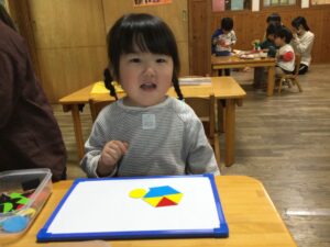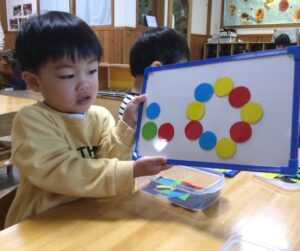 ホワイトボードに丸や三角などのマグネットシートをくっつけて、いろんな形を作ってあそんでいます。