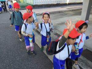 みんなで手をつないで行くよ。道を渡るときはしっかり手をあげよう!