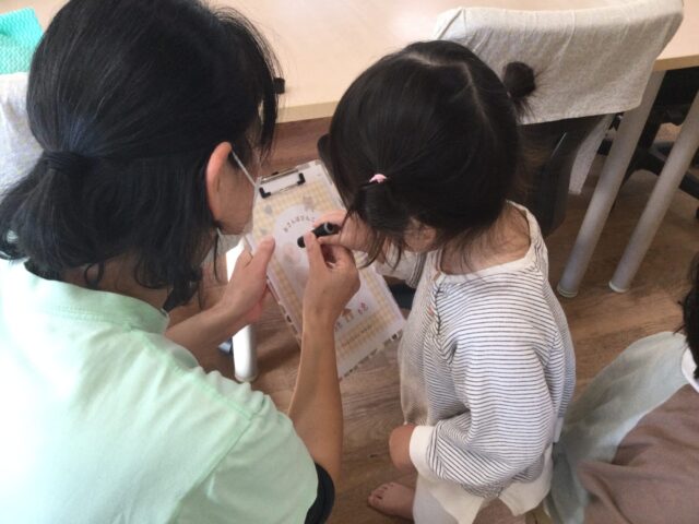 本物の宅配便屋さんのように、伝票に見立てた紙に保育教諭と一緒にハンコを押しました。